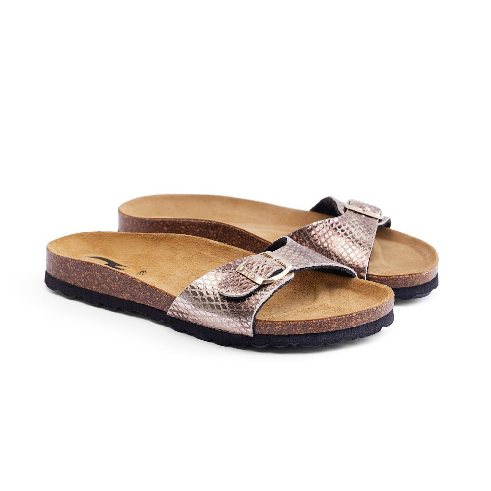 DAMA-PYTHON is a sandal designed for everyday comfort with bold texture. Built with premium synthetic leather and a Spanish cork footbed, it balances style and support.