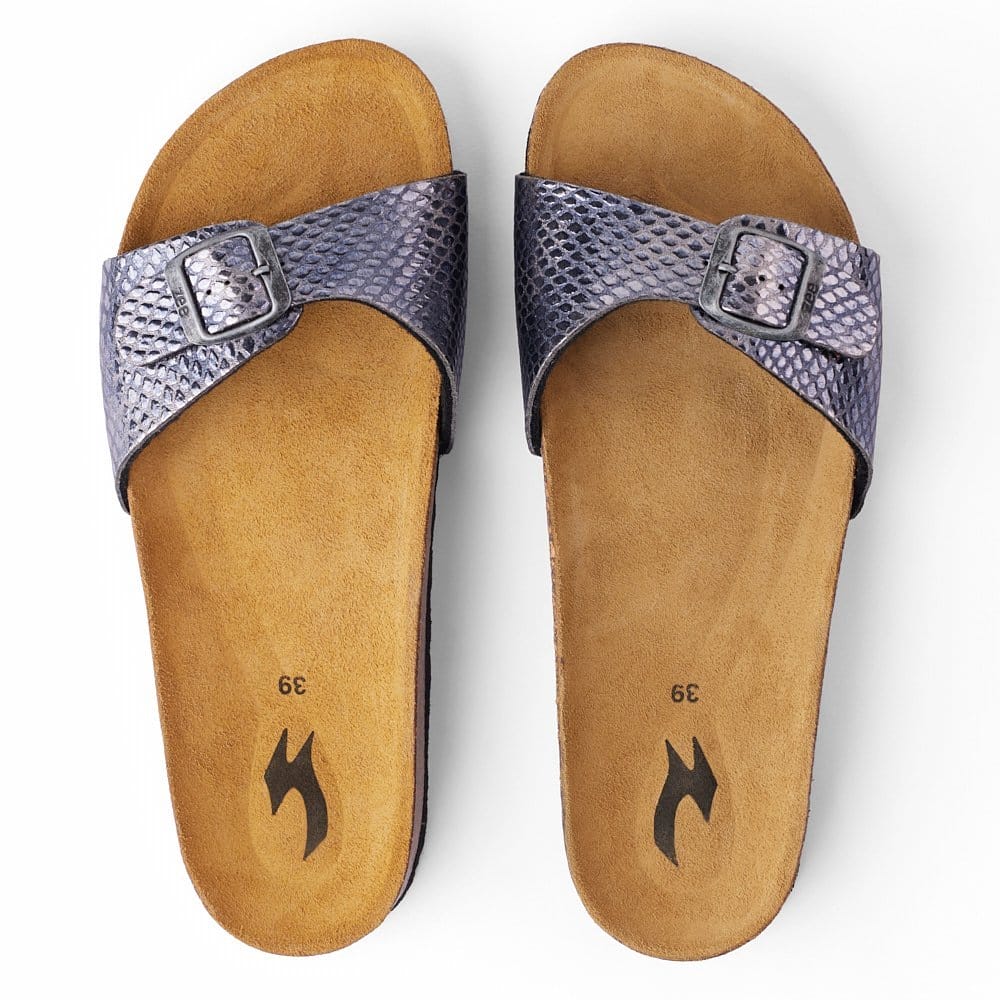 DAMA-PYTHON is a sandal designed for everyday comfort with bold texture. Built with premium synthetic leather and a Spanish cork footbed, it balances style and support.